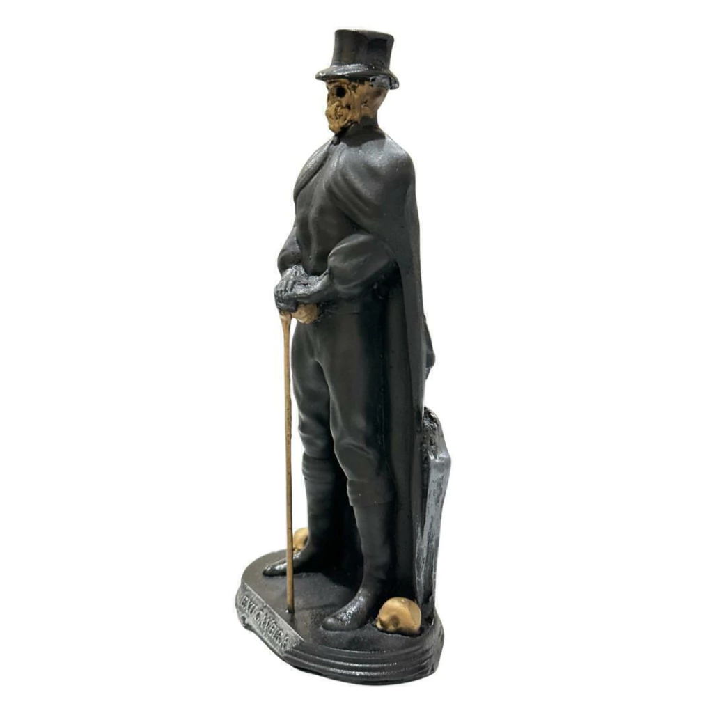 Imagem de Exu Caveira, confeccionada com riqueza de detalhes, medindo aproximadamente 15cm de altura. Representa com firmeza e respeito essa poderosa entidade da linha dos Exus, conhecida por atuar nas demandas espirituais mais profundas, quebrando feitiços, protegendo contra energias negativas e conduzindo a transformação interior.