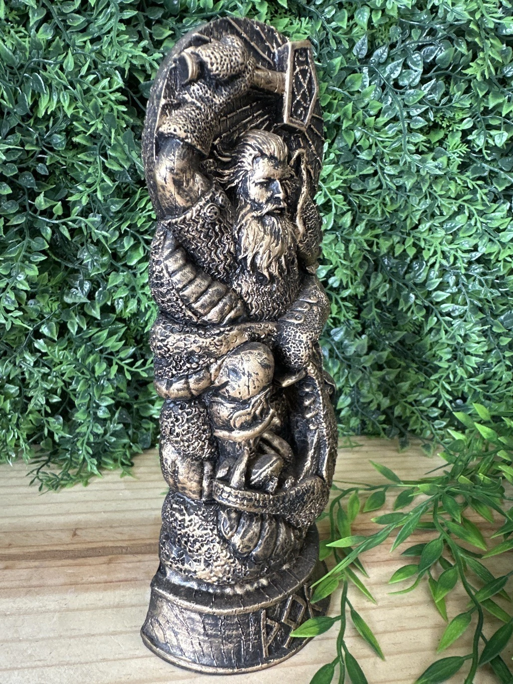 Traga a força e a mitologia nórdica para sua casa! A Imagem de Thor, toda em bronze, é uma obra-prima que encanta e inspira. Com um design impressionante, ela captura o deus do trovão em pleno combate, enfrentando uma criatura feroz que o ataca.