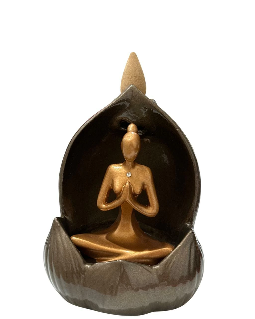 O Incensário Cascata Yoga na Flor de Lótus é uma peça inspiradora que une espiritualidade, arte e serenidade. Projetado para incensos do tipo backflow (fluxo reverso), ele cria um hipnotizante efeito visual onde a fumaça escorre suavemente em forma de cascata, envolvendo a figura em meditação sobre uma flor de lótus — símbolo sagrado de pureza, despertar e iluminação.