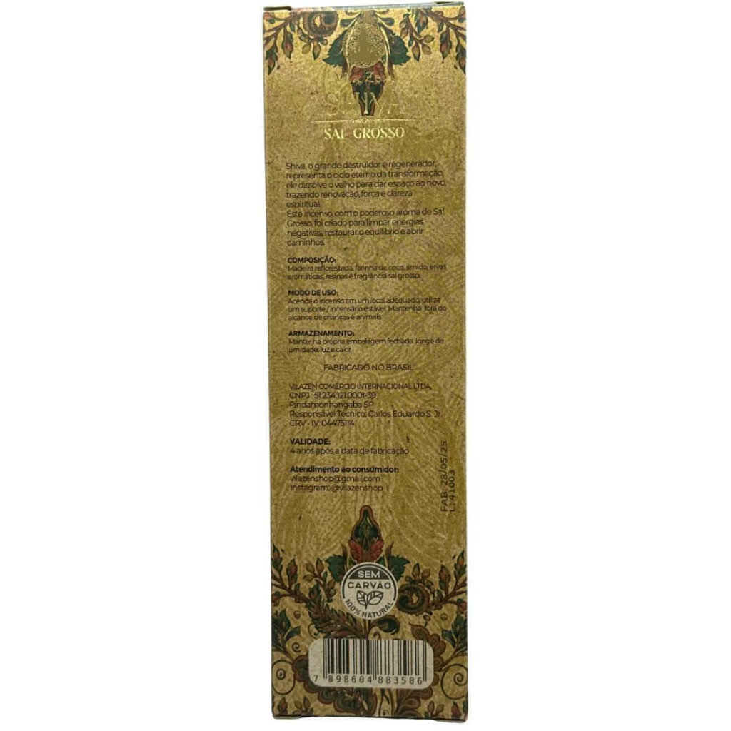 O Incenso Natural Vila Zen Deuses Sal Grosso Shiva é um poderoso instrumento de purificação e transmutação energética. Inspirado na força transformadora de Shiva, o aroma fresco e mineral do sal grosso ajuda a limpar o ambiente, afastar energias negativas e proteger o campo espiritual.